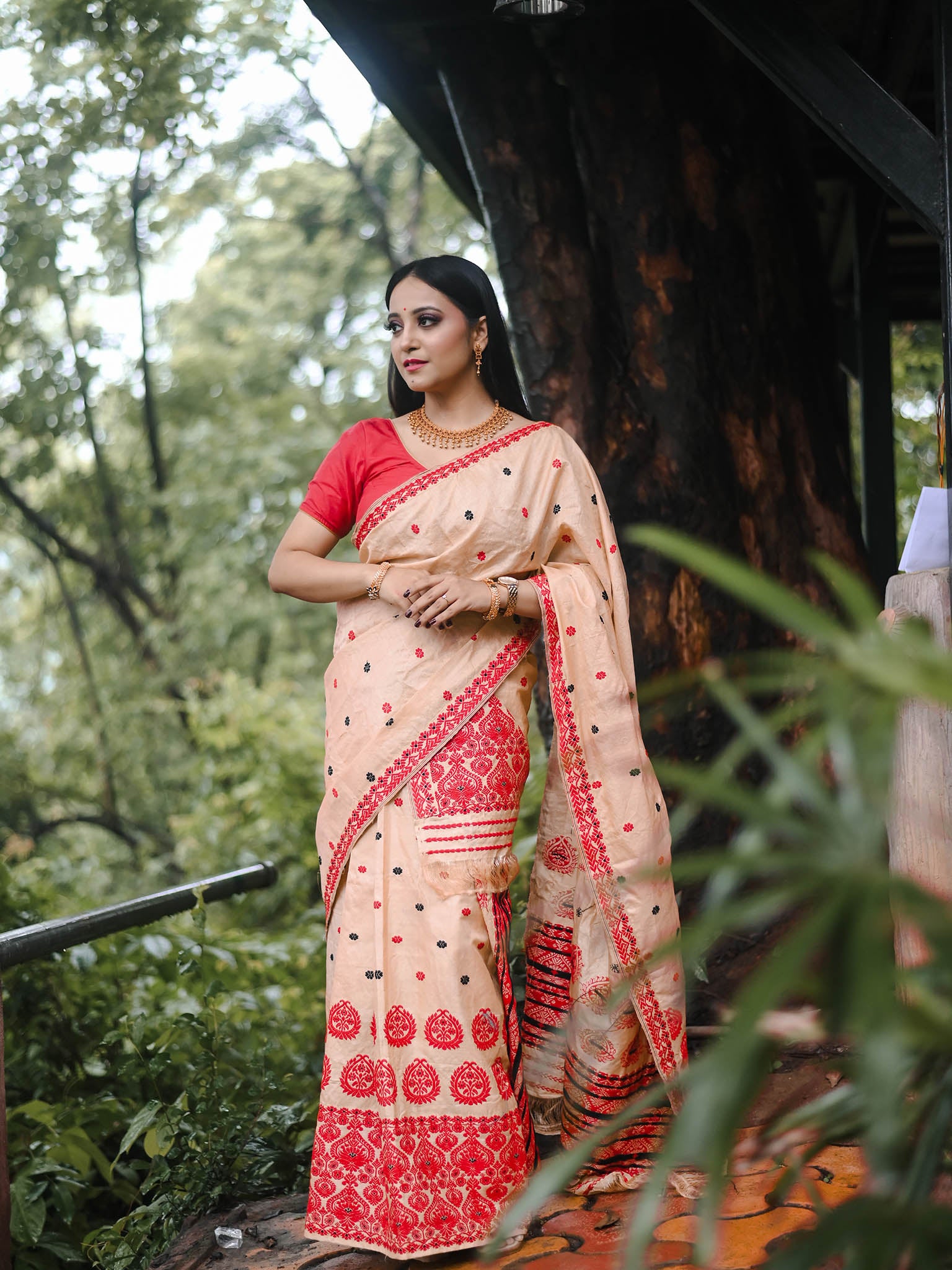 An exquisite work of woven artistry, this opulent Albescent White and Maroon Muga silk Mekhela Sador, adorned with splendid Axomiya phool buta throughout, is destined to garner admiration this season.