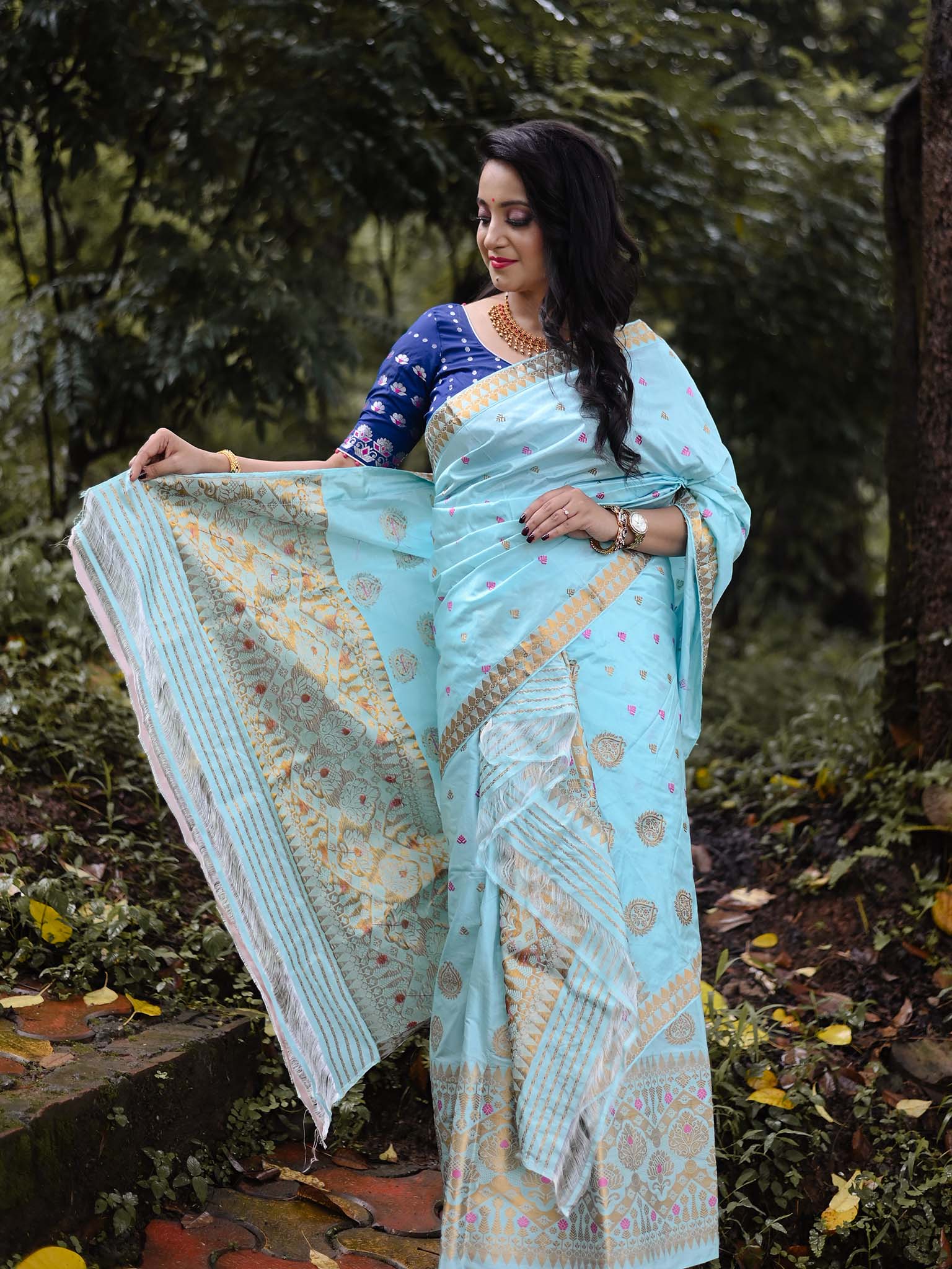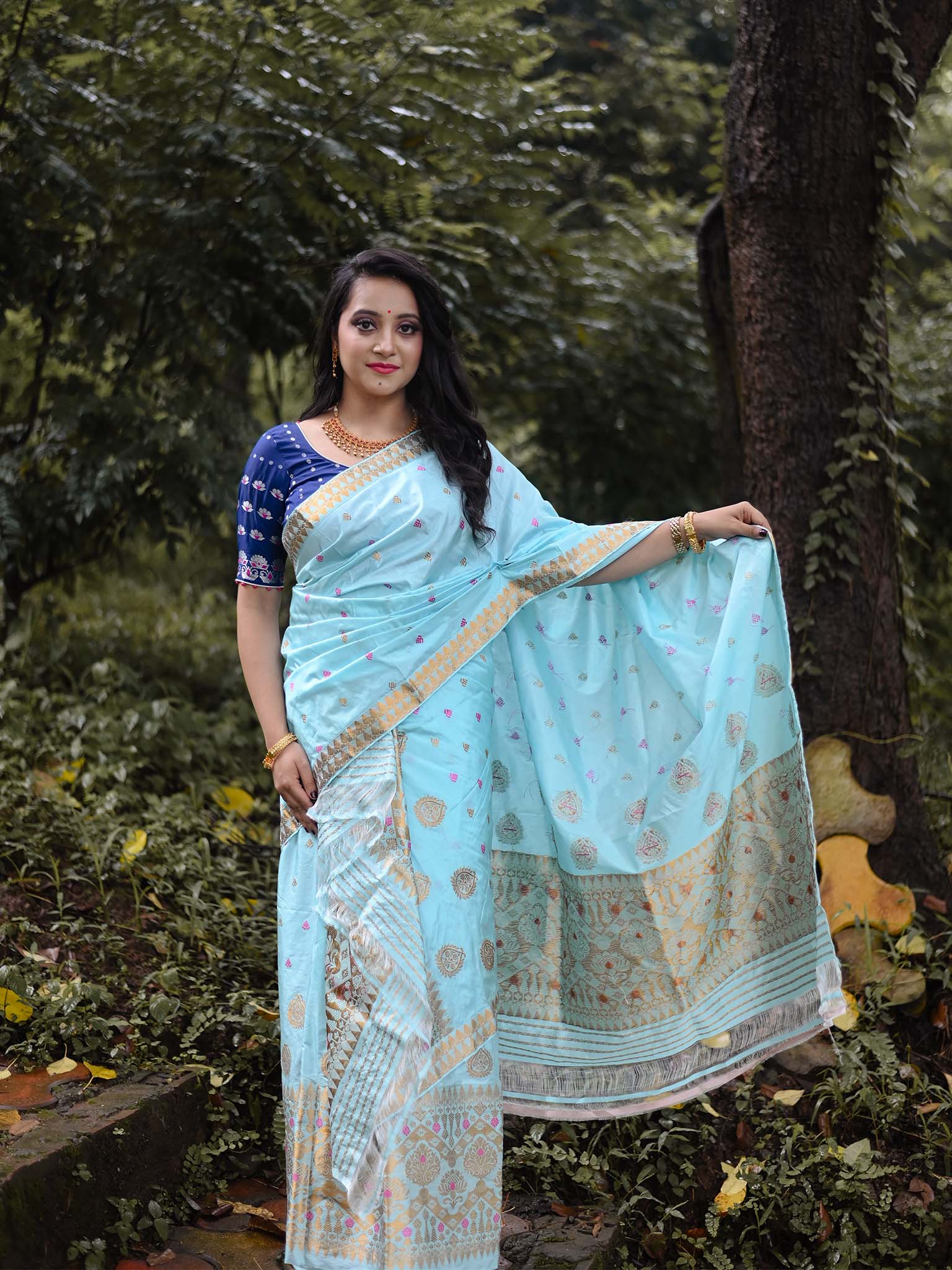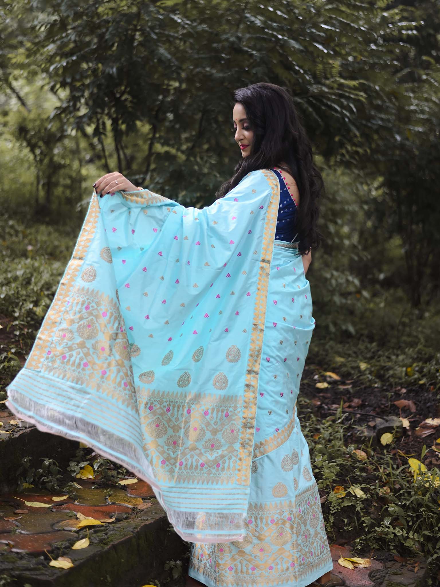 Blizzard Blue Pure Paat Silk Mekhela Sador